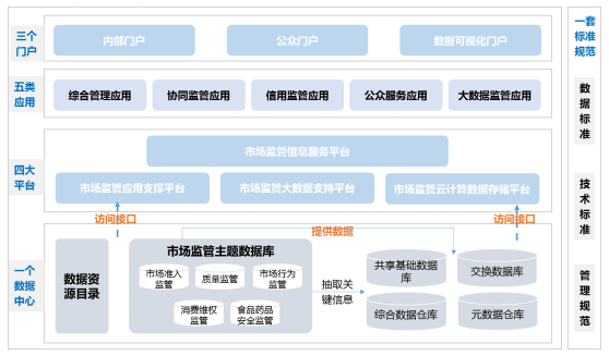 一套标准规范: 建立统一市场监管的数据标准、技术标准、管理规范等, 从而确保市场监管信息平台与各项业务系统之间互联互通。