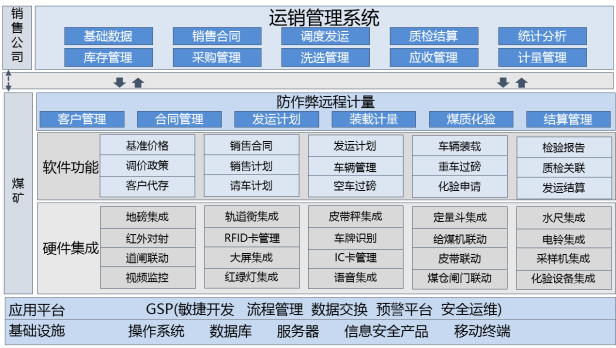 煤炭运销是矿业集团的核心核心业务,煤炭运销涉及流程长、数据量大,牵涉面广,业务灵活多变化、计量方式多样。运销过程覆盖外部煤供应商、煤炭运销公司、煤质化验中心、各驻矿运销分部、地磅、轨道衡、各种磅房监控设备。随着行业开展,煤炭企业开始从自产煤销售拓展到煤炭贸易、供应链金融等多种业务。煤炭运销管理要求实现集团运销管控与各矿现场发运、无人值守计量控制的业务集成,要求各部门数据共享,协同操作。